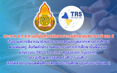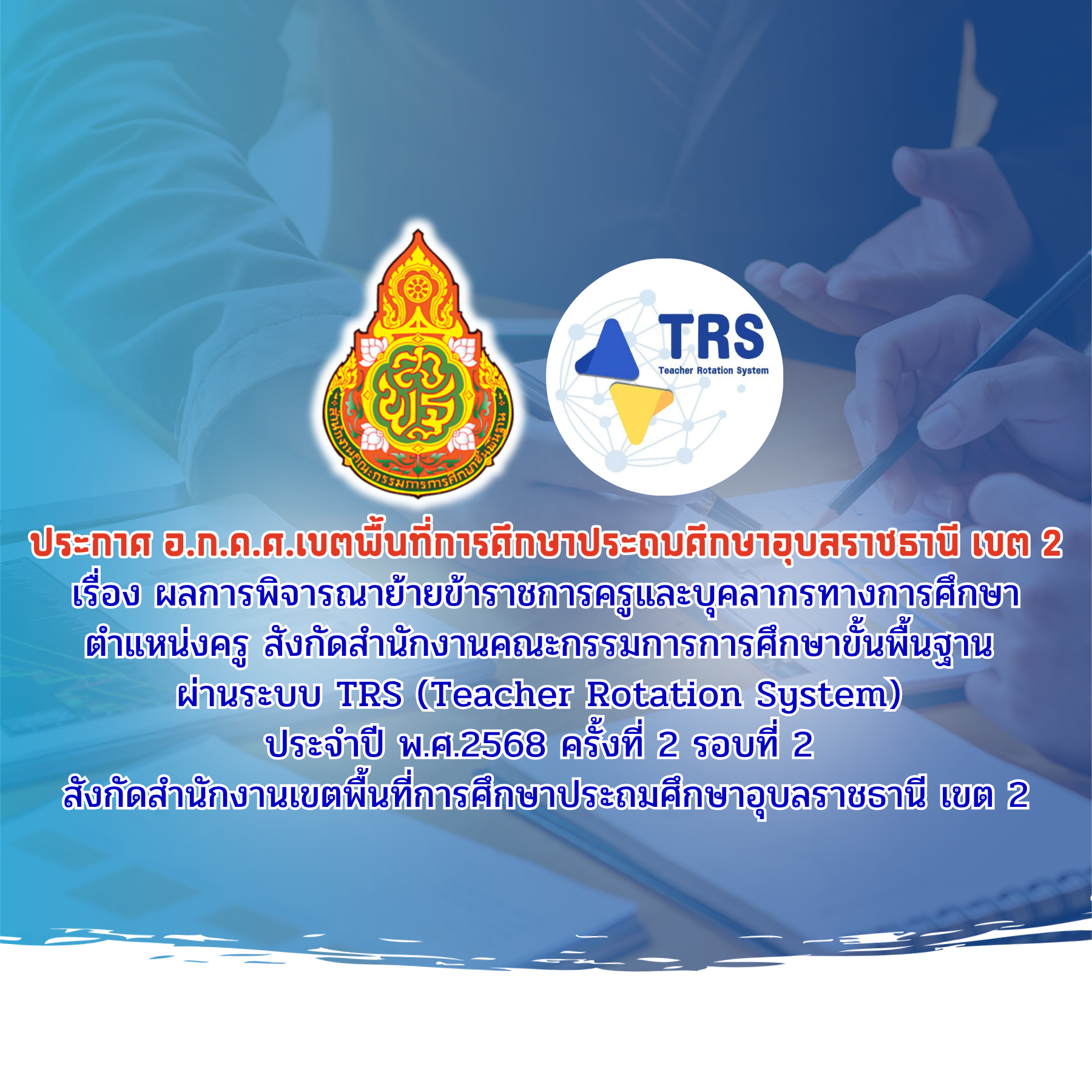 ประกาศ อ.ก.ค.ศ.เขตพื้นที่การศึกษาประถมศึกษาอุบลราชธานี เขต 2 เรื่อง ผลการพิจารณาย้ายข้าราชการครูและบุคลากรทางการศึกษา ตำแหน่งครู สังกัดสำนักงานคณะกรรมการการศึกษาขั้นพื้นฐาน ผ่านระบบ TRS (Teacher Rotation System) ประจำปี พ.ศ.2568 ครั้งที่ 2 รอบที่ 2 สังกัดสำนักงานเขตพื้นที่การศึกษาประถมศึกษาอุบลราชธานี เขต 2