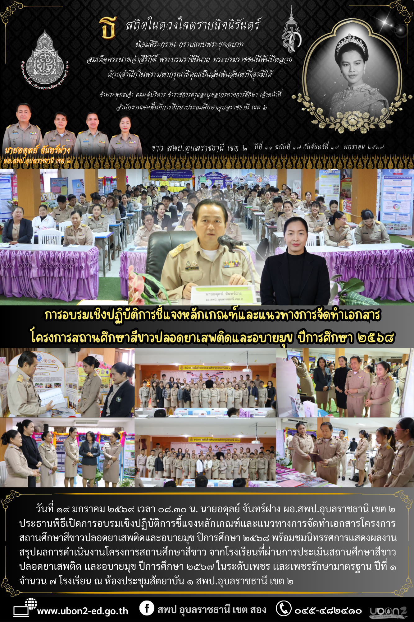 ข่าวประชาสัมพันธ์ ภารกิจ ผอ.สพป. ประธานพิธีเปิดการอบรมเชิงปฏิบัติการชี้แจงหลักเกณฑ์และแนวทางการจัดทำเอกสารโครงการสถานศึกษาสีขาวปลอดยาเสพติดและอบายมุข ปีการศึกษา ๒๕๖๘