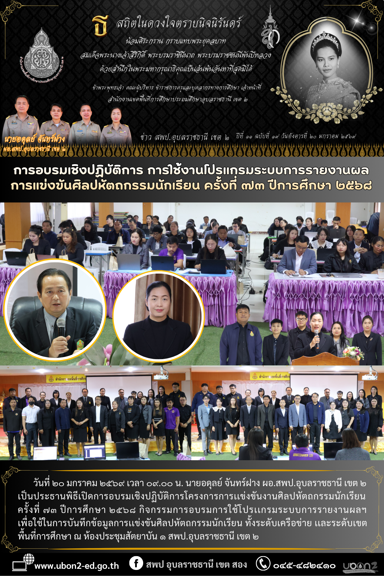 ข่าวประชาสัมพันธ์ ภารกิจ ผอ.สพป. การอบรมเชิงปฏิบัติการ การใช้งานโปรแกรมระบบการรายงานผลการแข่งขันศิลปหัตถกรรมนักเรียน ครั้งที่ ๗๓ ปีการศึกษา ๒๕๖๘