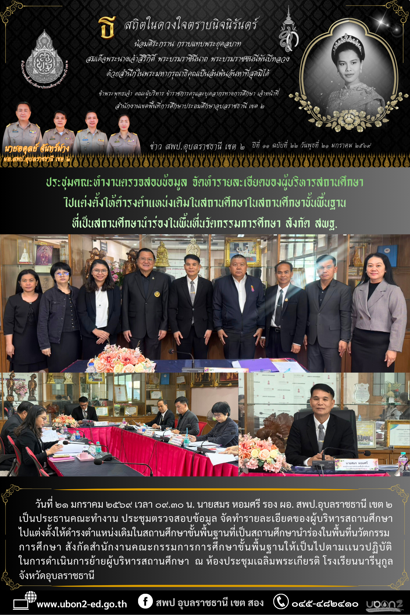 ข่าวประชาสัมพันธ์ ประชุมคณะทำงานตรวจสอบข้อมูล จัดทำรายละเอียดของผู้บริหารสถานศึกษาไปแต่งตั้งให้ดำรงตำแหน่งเดิมในสถานศึกษาในสถานศึกษาขั้นพื้นฐานที่เป็นสถานศึกษานำร่องในพื้นที่นวัตกรรมการศึกษา สังกัด สพฐ