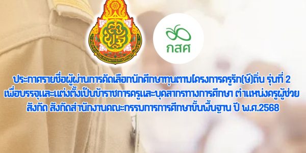 ประกาศ อ.ก.ค.ศ. เขตพื้นที่การศึกษาประถมศึกษาอุบลราชธานี เขต 2 เรื่องรายชื่อผู้ผ่านการคัดเลือกนักศึกษาทุน ตามโครงการครูรัก(ษ์)ถิ่น รุ่นที่ 2 เพื่อบรรจุและแต่งตั้งเป็นข้าราชการครูและบุคลากรทางการศึกษา ตำแหน่งครูผู้ช่วย สังกัดสำนักงานคณะกรรมการการศึกษาขั้นพื้นฐาน ปี พ.ศ.2568
