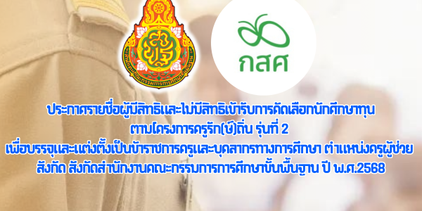 ประกาศ อ.ก.ค.ศ.เขตพื้นที่การศึกษาประถมศึกษาอุบลราชธานี เขต 2 เรื่อง รายชื่อผู้มีสิทธิและไม่มีสิทธิเข้ารับการคัดเลือกนักศึกษาทุนตามโครงการครูรัก(ษ์)ถิ่น รุ่นที่ 2 เพื่อบรรจุและแต่งตั้งเป็นข้าราชการครูและบุคลากรทางการศึกษา ตำแหน่งครูผู้ช่วย สังกัดสำนักงานคณะกรรมการการศึกษาขั้นพื้นฐาน ปี พ.ศ.2568
