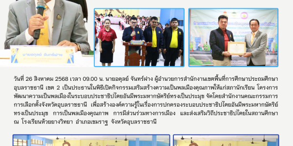 วันที่ 26 สิงหาคม 2568 เวลา 09.00 น. นายอดุลย์ จันทร์ฝาง ผู้อำนวยการสำนักงานเขตพื้นที่การศึกษาประถมศึกษาอุบลราชธานี เขต 2 เป็นประธานในพิธีเปิดกิจกรรมเสริมสร้างความเป็นพลเมืองคุณภาพให้แก่สภานักเรียน โครงการพัฒนาความเป็นพลเมืองในระบอบประชาธิปไตยอันมีพระมหากษัตริย์ทรงเป็นประมุข จัดโดยสำนักงานคณะกรรมการการเลือกตั้งจังหวัดอุบลราชธานี เพื่อสร้างองค์ความรู้ในเรื่องการปกครองระบอบประชาธิปไตยอันมีพระมหากษัตริย์ทรงเป็นประมุข การเป็นพลเมืองคุณภาพการมีส่วนร่วมทางการเมือง และส่งเสริมวิถีประชาธิปไตยในสถานศึกษา ณ โรงเรียนห้วยยางวิทยา อำเภอเขมราฐ จังหวัดอุบลราชธานี