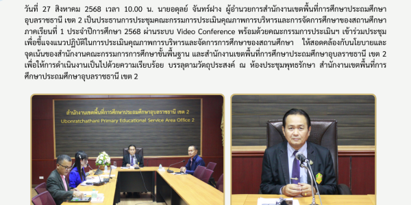 วันที่ 27 สิงหาคม 2568 เวลา 10.00 น. นายอดุลย์ จันทร์ฝาง ผู้อำนวยการสำนักงานเขตพื้นที่การศึกษาประถมศึกษาอุบลราชธานี เขต 2 เป็นประธานการประชุมคณะกรรมการประเมินคุณภาพการบริหารและการจัดการศึกษาของสถานศึกษา ภาคเรียนที่ 1 ประจำปีการศึกษา 2568 ผ่านระบบ Video Conference พร้อมด้วยคณะกรรมการประเมินฯ เข้าร่วมประชุม เพื่อชี้แจงแนวปฏิบัติในการประเมินคุณภาพการบริหารและจัดการการศึกษาของสถานศึกษา ให้สอดคล้องกับนโยบายและจุดเน้นของสำนักงานคณะกรรมการการศึกษาขั้นพื้นฐาน และสำนักงานเขตพื้นที่การศึกษาประถมศึกษาอุบลราชธานี เขต 2 เพื่อให้การดำเนินงานเป็นไปด้วยความเรียบร้อย บรรลุตามวัตถุประสงค์ ณ ห้องประชุมพุทธรักษา สำนักงานเขตพื้นที่การศึกษาประถมศึกษาอุบลราชธานี เขต 2