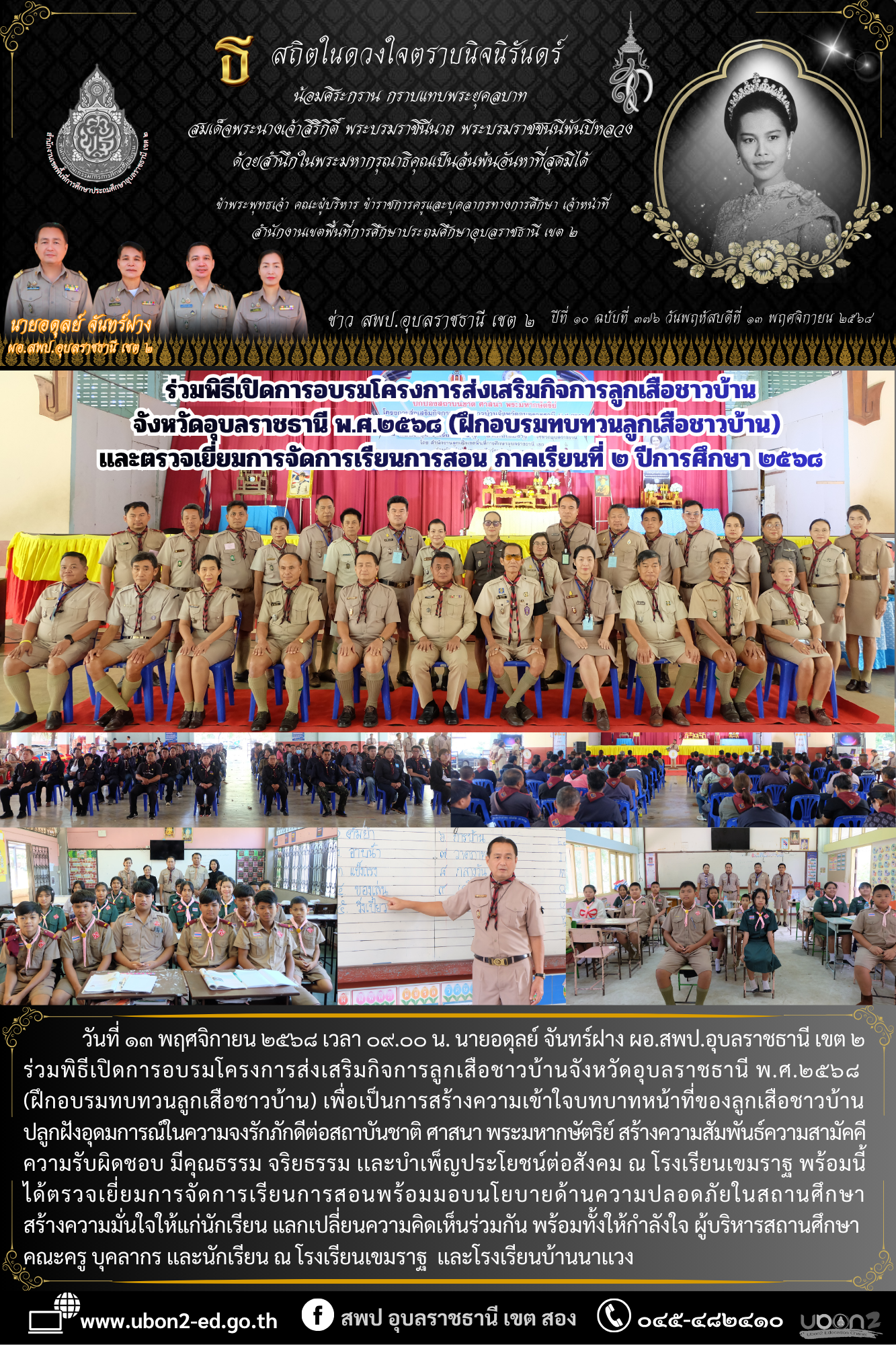 ข่าวประชาสัมพันธ์ ภารกิจ ผอ.สพป. เยี่ยมเเละพบปะผู้เข้ารับการอบรมโครงการส่งเสริมกิจการลูกเสือชาวบ้านจังหวัดอุบลราชธานี พ.ศ.๒๕๖๘ (ฝึกอบรมทบทวนลูกเสือชาวบ้าน) เเละตรวจเยี่ยมการจัดการเรียนการสอน ภาคเรียนที่ ๒ ปีการศึกษา ๒๕๖๘