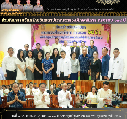 วันที่ ๑๑ เมษายน ๒๕๖๗ ว่าที่ร้อยตรีวิชชากร วงศ์จริยะกรณ์ ผอ.สพป.อำนาจเจริญ ปฏิบัติราชการในตำแหน่ง ผอ.สพป.อุบลราชธานี เขต ๒ จัดดกิจกรรมสืบสานวัฒนธรรมประเพณีวันสงกรานต์ ประจำปี ๒๕๖๗ โดยได้ถวายภัตตาหารเพลแด่พระภิกษุสงฆ์ กิจกรรมไหว้พระขอพรและสรงน้ำพระพุทธรูปประจำสำนักงาน พร้อมทั้งกิจกรรมรดน้ำขอพรจากผู้ใหญ่และผู้บังคับบัญชา เนื่องในโอกาสประเพณีเทศกาลสงกรานต์ ประจำปี ๒๕๖๗ เพื่อเป็นการรักษาวัฒนธรรมประเพณีอันดีงามที่เคยปฏิบัติร่วมกันมา ณ ห้องประชุมสัตยาบัน ๑ สพป.อุบลราชธานี เขต ๒