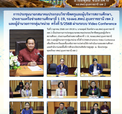 วันที่ ๑๖ กรกฎาคม ๒๕๖๗ เวลา ๐๙.๐๐ น. ว่าที่ร้อยตรีวิชชากร วงศ์จริยะกรณ์ ผอ.สพป.อุบลราชธานี เขต ๒ ร่วมประชุมคณะกรมการจังหวัดอุบลราชธานี หัวหน้าส่วนราชการ หัวหน้าหน่วยงานรัฐวิสาหกิจและนายอำเภอประจำเดือนกรกฎาคม ๒๕๖๗ เพื่อรับทราบนโยบายและข้อราชการเร่งด่วน การดำเนินงาน การรายงานประเด็นปัญหาและอุปสรรคการดําเนินงาน ตามแผนงาน/โครงการ พร้อมร่วมหารือและบูรณาการเชิงปฏิบัติการกับส่วนราชการที่เกี่ยวข้องเพื่อขับเคลื่อนนโยบายสำคัญในการบริหารงานของจังหวัดในแต่ละด้าน ณ ห้องประชุมพรหมวรราช ชั้น ๔ ศาลากลางจังหวัดอุบลราชธานี โดยมี นายสมเพชร สร้อยสระคู รองผู้ว่าราชการจังหวัดอุบลราชธานี เป็นประธานพิธี