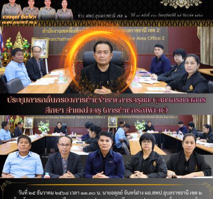 วันที่ 5 มิถุนายน 2568 เวลา 08.30 น. นายอดุลย์ จันทร์ฝาง ผู้อำนวยการสำนักงานเขตพื้นที่การศึกษาประถมศึกษาอุบลราชธานี เขต 2 พร้อมด้วย รองผู้อำนวยการสำนักงานเขตพื้นที่การศึกษาประถมศึกษาอุบลราชธานี เขต 2 ทุกท่าน ผู้อำนวยการกลุ่ม/หน่วย และบุคลากรในสังกัด เข้าร่วมการประชุมผู้อำนวยการสำนักงานเขตพื้นที่การศึกษาทั่วประเทศ ครั้งที่ 5/2568 โดยมีว่าที่ร้อยตรี ธนุ วงษ์จินดา เลขาธิการคณะกรรมการการศึกษาขั้นพื้นฐาน เป็นประธานการประชุม เพื่อมอบนโยบาย แจ้งข้อราชการสำคัญและการติดตามการขับเคลื่อนนโยบาย จาก สพฐ. พร้อมให้ผู้อำนวยการสำนักงานเขตพื้นที่การศึกษา นำเสนอการตรวจเยี่ยมโรงเรียนเปิดภาคเรียนที่ 1/2568 ของโรงเรียนในสังกัด ผ่านระบบ Video Conference ณ ห้องประชุมพุทธรักษา สำนักงานเขตพื้นที่การศึกษาประถมศึกษาอุบลราชธานี เขต 2