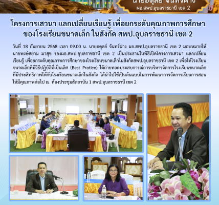 วันที่ 10 มิถุนายน 2568 เวลา 09.00 น. นายอดุลย์ จันทร์ฝาง ผู้อำนวยการสำนักงานเขตพื้นที่การศึกษาประถมศึกษาอุบลราชธานี เขต 2 เป็นประธานการประชุมนายกสมาคมผู้ประกอบวิชาชีพครูและผู้บริหารสถานศึกษา, ประธานเครือข่ายสถานศึกษาที่ 1-19, รอง ผอ.สพป.อุบลราชธานี เขต 2 และ ผอ.กลุ่ม /หน่วย ครั้งที่ 3/2568 ผ่านระบบ Video Conference เพื่อแจ้งข้อราชการเร่งด่วน กำกับ ติดตาม สร้างความร่วมมือร่วมใจในการปฏิบัติงานตามนโยบาย ให้สามารถขับเคลื่อนคุณภาพการศึกษาขั้นพื้นฐานสู่การปฏิบัติให้ประสบผลสำเร็จ ณ ห้องประชุมพุทธรักษา สำนักงานเขตพื้นที่การศึกษาประถมศึกษาอุบลราชธานี เขต 2