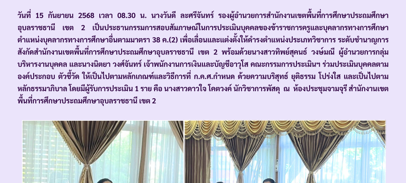 วันที่ 15 กันยายน 2568 เวลา 08.30 น. นางวันดี ละศรีจันทร์ รองผู้อำนวยการสำนักงานเขตพื้นที่การศึกษาประถมศึกษาอุบลราชธานี เขต 2 เป็นประธานกรรมการสอบสัมภาษณ์ในการประเมินบุคคลของข้าราชการครูและบุคลากรทางการศึกษา ตำแหน่งบุคลากรทางการศึกษาอื่นตามมาตรา 38 ค.(2) เพื่อเลื่อนและแต่งตั้งให้ดำรงตำแหน่งประเภทวิชาการ ระดับชำนาญการ สังกัดสำนักงานเขตพื้นที่การศึกษาประถมศึกษาอุบลราชธานี เขต 2 พร้อมด้วยนางสาวทิพย์สุคนธ์ วงษ์มณี ผู้อำนวยการกลุ่มบริหารงานบุคคล และนางนิตยา วงศ์จันทร์ เจ้าพนักงานการเงินและบัญชีอาวุโส คณะกรรมการประเมินฯ ร่วมประเมินบุคคลตามองค์ประกอบ ตัวชี้วัด ให้เป็นไปตามหลักเกณฑ์และวิธีการที่ ก.ค.ศ.กำหนด ด้วยความบริสุทธ์ ยุติธรรม โปร่งใส และเป็นไปตามหลักธรรมาภิบาล โดยมีผู้รับการประเมิน 1 ราย คือ นางสาวดาวใจ โคตวงค์ ณ ห้องประชุมจามจุรี สำนักงานเขตพื้นที่การศึกษาประถมศึกษาอุบลราชธานี เขต 2