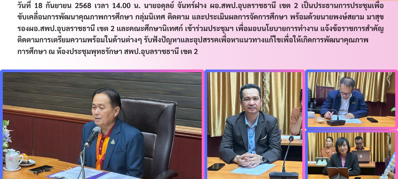 วันที่ 18 กันยายน 2568 เวลา 14.00 น. นายอดุลย์ จันทร์ฝาง ผอ.สพป.อุบลราชธานี เขต 2 เป็นประธานการประชุมเพื่อขับเคลื่อนการพัฒนาคุณภาพการศึกษา กลุ่มนิเทศ ติดตาม และประเมินผลการจัดการศึกษา พร้อมด้วย นายพงษ์สยาม มาสุข รองผอ.สพป.อุบลราชธานี เขต 2 และคณะศึกษานิเทศก์ เข้าร่วมประชุมฯ เพื่อมอบนโยบายการทำงาน แจ้งข้อราชการสำคัญ ติดตามการเตรียมความพร้อมในด้านต่างๆ รับฟังปัญหาและอุปสรรคเพื่อหาแนวทางแก้ไขเพื่อให้เกิดการพัฒนาคุณภาพการศึกษา ณ ห้องประชุมพุทธรักษา สพป.อุบลราชธานี เขต 2