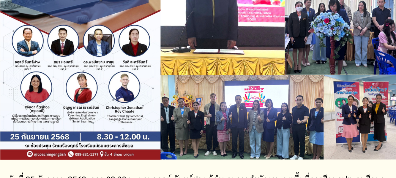 วันที่ 25 กันยายน 2568 เวลา 08.30 น. นายอดุลย์ จันทร์ฝาง ผู้อำนวยการสำนักงานเขตพื้นที่การศึกษาประถมศึกษาอุบลราชธานี เขต 2 มอบหมายให้นายพงษ์สยาม มาสุข รองผู้อำนวยการสำนักงานเขตพื้นที่การศึกษาประถมศึกษาอุบลราชธานี เขต 2 เป็นประธานในพิธีเปิดโครงการอบรมเชิงปฏิบัติการ “นวัตกรรมสื่อการสอนภาษาอังกฤษในยุคดิจิทัล” ซึ่งจัดโดยโรงเรียนสอนภาษาโค้ชชิ่ง อิงลิช เพื่อให้ครูผู้สอนในสังกัดนำระบบการเรียนภาษาอังกฤษออนไลน์ Smart Learning ไปสอนนักเรียนระดับชั้นอนุบาลถึงประถมศึกษาปีที่ 6 โดยมุ่งเน้นการเรียนรู้ตามกรอบ CEFR และสอดคล้องกับหลักสูตรแกนกลางการศึกษาขั้นพื้นฐาน ณ ห้องประชุมรัตนเรืองฤทธิ์ โรงเรียนมัธยมตระการพืชผล