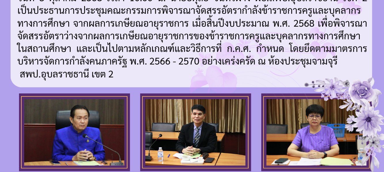 วันที่ 3 ตุลาคม 2568 เวลา 10.00 น. นายอดุลย์ จันทร์ฝาง ผอ.สพป.อุบลราชธานี เขต 2 เป็นประธานการประชุมคณะกรรมการพิจารณาจัดสรรอัตรากำลังข้าราชการครูและบุคลากรทางการศึกษา จากผลการเกษียณอายุราชการ เมื่อสิ้นปีงบประมาณ พ.ศ. 2568 เพื่อพิจารณาจัดสรรอัตราว่างจากผลการเกษียณอายุราชการของข้าราชการครูและบุคลากรทางการศึกษาในสถานศึกษา และเป็นไปตามหลักเกณฑ์และวิธีการที่ ก.ค.ศ. กำหนด โดยยึดตามมาตรการบริหารจัดการกำลังคนภาครัฐ พ.ศ. 2566 – 2570 อย่างเคร่งครัด ณ ห้องประชุมจามจุรี สพป.อุบลราชธานี เขต 2