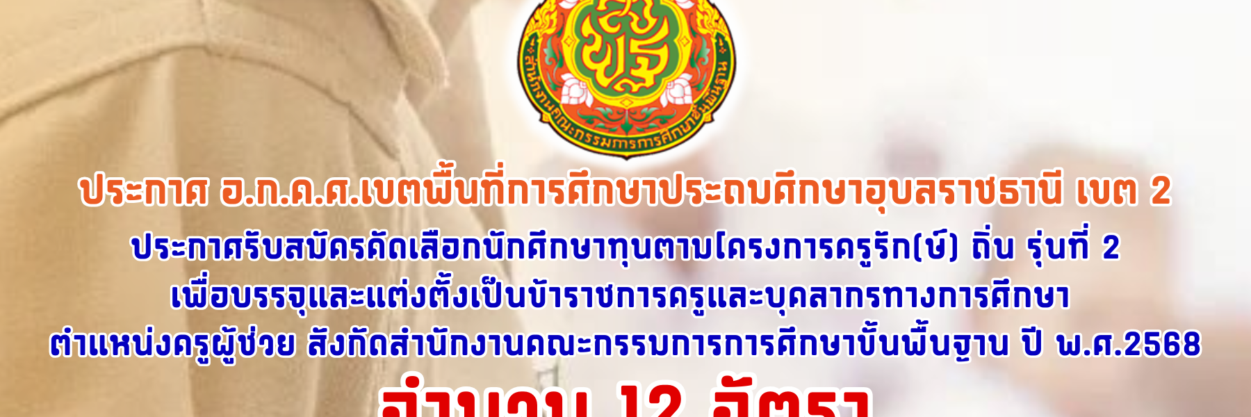 ประกาศ รับสมัครคัดเลือกนักศึกษาทุนตามโครงการครูรัก(ษ์)ถิ่น รุ่นที่ 2 เพื่อบรรจุและแต่งตั้งเป็นข้าราชการครูและบุคลากรทางการศึกษา ตำแหน่งครูผู้ช่วย สังกัด สพฐ. ปี พ.ศ.2568