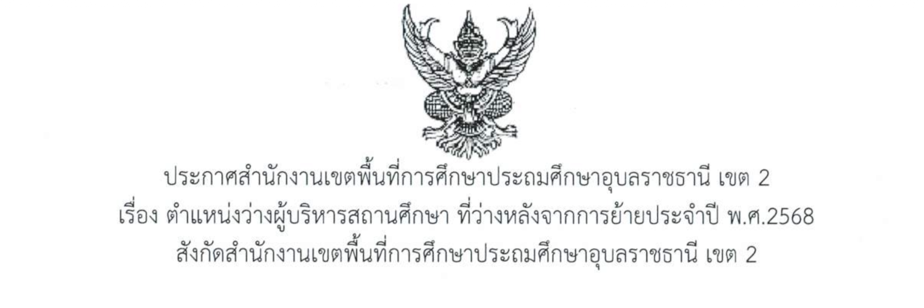 ประกาศ ตำแหน่งว่างผู้บริหารสถานศึกษา ที่ว่างหลังจากการย้ายประจำปี พ.ศ.2568 สังกัดสำนักงานเขตพื้นที่การศึกษาประถมศึกษาอุบลราชธานี เขต 2