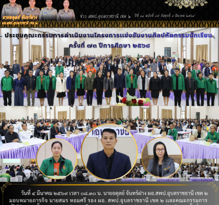 วันที่ ๑๑ ตุลาคม ๒๕๖๘ เวลา ๐๘.๓๐ น. นายอดุลย์ จันทร์ฝาง ผอ.สพป.อุบลราชธานี เขต ๒ เป็นประธานพิธีทำบุญทอดกฐินสามัคคี สพป.อุบลราชธานี เขต ๒ ณ วัดอินทาราม บ้านกาบิน ตำบลกาบิน อำเภอกุดข้าวปุ้น จังหวัดอุบลราชธานี เพื่อถวายปัจจัยในการก่อสร้างเสนาสนะไว้ในพุทธศาสนาและให้ข้าราชการครูและบุคลากรทางการศึกษา นักเรียน และประชาชนทั่วไป ได้ร่วมสร้างบุญกุศล สร้างความรักสามัคคีระหว่างพุทธบริษัท ทำนุบำรุงและสืบสานวัฒนธรรมขนบธรรมเนียมประเพณีในพระพุทธศาสนา ให้มีความเจริญรุ่งเรืองสืบไป
