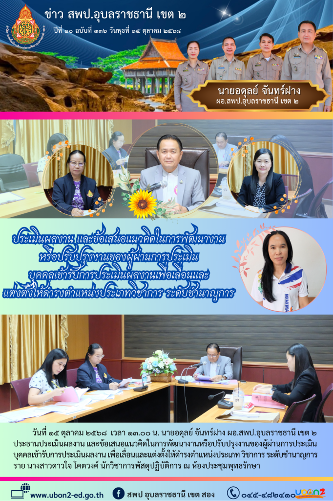 วันที่ ๑๕ ตุลาคม ๒๕๖๘ เวลา ๑๓.๐๐ น. นายอดุลย์ จันทร์ฝาง ผอ.สพป.อุบลราชธานี เขต ๒ ประธานประเมินผลงาน และข้อเสนอแนวคิดในการพัฒนางานหรือปรับปรุงงานของผู้ผ่านการประเมินบุคคลเข้ารับการประเมินผลงาน เพื่อเลื่อนและแต่งตั้งให้ดำรงตำแหน่งประเภท วิชาการ ระดับชำนาญการ ราย นางสาวดาวใจ โคตวงค์ นักวิชาการพัสดุปฏิบัติการ ณ ห้องประชุมพุทธรักษา