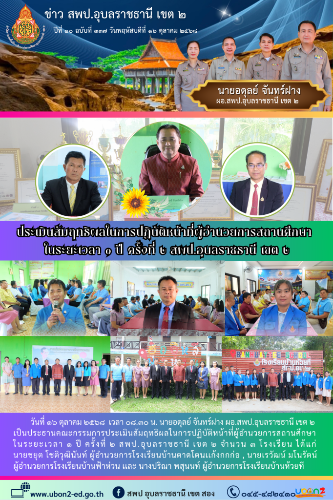 วันที่ ๑๖ ตุลาคม ๒๕๖๘ เวลา ๐๘.๓๐ น. นายอดุลย์ จันทร์ฝาง ผอ.สพป.อุบลราชธานี เขต ๒ เป็นประธานคณะกรรมการประเมินสัมฤทธิผลในการปฏิบัติหน้าที่ผู้อำนวยการสถานศึกษา ในระยะเวลา ๑ ปี ครั้งที่ ๒ สพป.อุบลราชธานี เขต ๒ จำนวน ๓ โรงเรียน ได้แก่ นายชยุต โชติวุฒินันท์ ผู้อำนวยการโรงเรียนบ้านตาดโตนเเก้งกกก่อ , นายเรวัฒน์ มโนรัตน์ ผู้อำนวยการโรงเรียนบ้านฟ้าห่วน เเละ นางปริณา พสุนนท์ ผู้อำนวยการโรงเรียนบ้านห้วยที