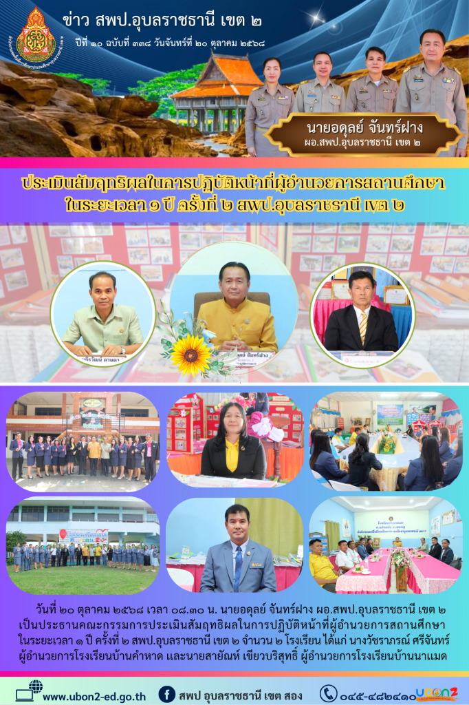 วันที่ ๒๐ ตุลาคม ๒๕๖๘ เวลา ๐๘.๓๐ น. นายอดุลย์ จันทร์ฝาง ผอ.สพป.อุบลราชธานี เขต ๒ เป็นประธานคณะกรรมการประเมินสัมฤทธิผลในการปฏิบัติหน้าที่ผู้อำนวยการสถานศึกษา ในระยะเวลา ๑ ปี ครั้งที่ ๒ สพป.อุบลราชธานี เขต ๒ จำนวน ๒ โรงเรียน ได้แก่ นางวัชราภรณ์ ศรีจันทร์ ผู้อำนวยการโรงเรียนบ้านคำหาด เเละนายสายัณห์ เขียวบริสุทธิ์ ผู้อำนวยการโรงเรียนบ้านนาเเมด
