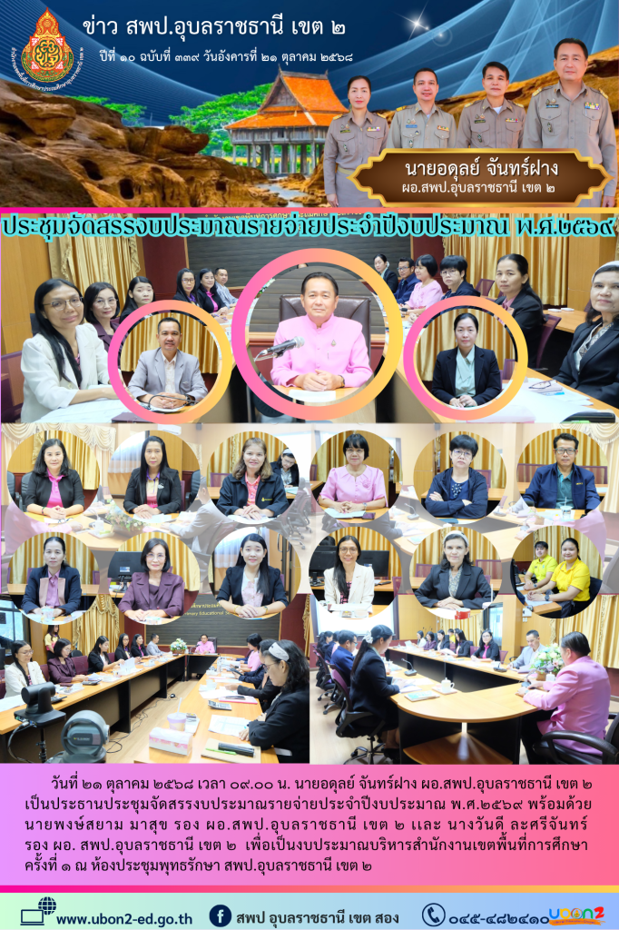 วันที่ ๒๑ ตุลาคม ๒๕๖๘ เวลา ๐๙.๐๐ น. นายอดุลย์ จันทร์ฝาง ผอ.สพป.อุบลราชธานี เขต ๒ เป็นประธานประชุมจัดสรรงบประมาณรายจ่ายประจำปีงบประมาณ พ.ศ.๒๕๖๙ พร้อมด้วย นายพงษ์สยาม มาสุข รอง ผอ.สพป.อุบลราชธานี เขต ๒ เเละ นางวันดี ละศรีจันทร์ รอง ผอ. สพป.อุบลราชธานี เขต ๒ เพื่อเป็นงบประมาณบริหารสำนักงานเขตพื้นที่การศึกษา ครั้งที่ ๑ ณ ห้องประชุมพุทธรักษา สพป.อุบลราชธานี เขต ๒
