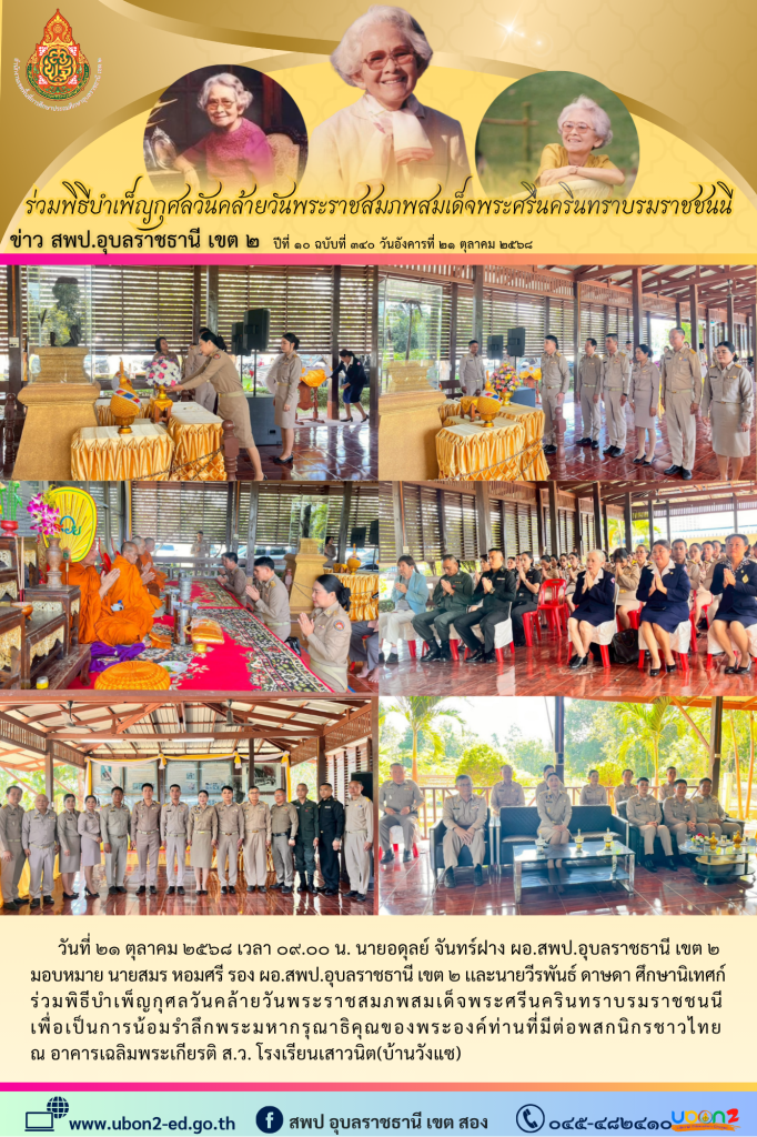 วันที่ ๒๑ ตุลาคม ๒๕๖๘ เวลา ๐๙.๐๐ น. นายอดุลย์ จันทร์ฝาง ผอ.สพป.อุบลราชธานี เขต ๒ มอบหมาย นายสมร หอมศรี รอง ผอ.สพป.อุบลราชธานี เขต ๒ เเละนายวีรพันธ์ ดาษดา ศึกษานิเทศก์ ร่่วมพิธีบำเพ็ญกุศลวันคล้ายวันพระราชสมภพสมเด็จพระศรีนครินทราบรมราชชนนี เพื่อเป็นการน้อมรำลึกพระมหากรุณาธิคุณของพระองค์ท่านที่มีต่อพสกนิกรชาวไทย ณ อาคารเฉลิมพระเกียรติ ส.ว. โรงเรียนเสาวนิต(บ้านวังแซ)