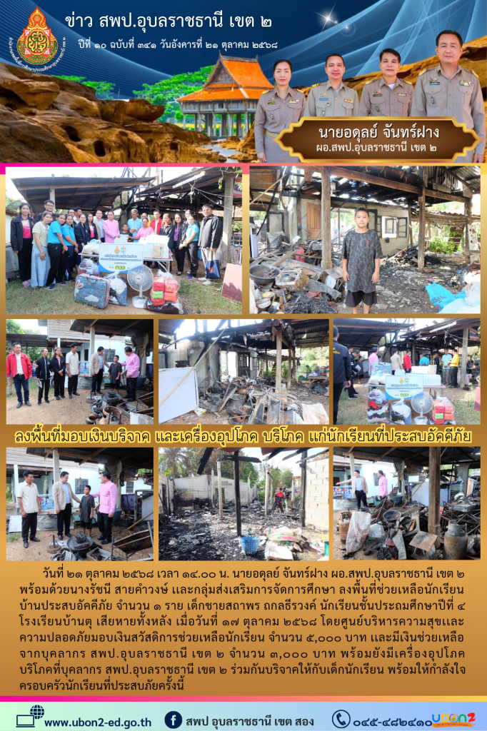 วันที่ ๒๑ ตุลาคม ๒๕๖๘ เวลา ๑๔.๐๐ น. นายอดุลย์ จันทร์ฝาง ผอ.สพป.อุบลราชธานี เขต ๒ พร้อมด้วยนางรัชนี สายคำวงษ์ เเละกลุ่มส่งเสริมการจัดการศึกษา ลงพื้นที่ช่วยเหลือนักเรียนบ้านประสบอัคคีภัย จำนวน ๑ ราย เด็กชายสถาพร ถกลธีรวงค์ นักเรียนชั้นประถมศึกษาปีที่ ๔ โรงเรียนบ้านตุ เสียหายทั้งหลัง เมื่อวันที่ ๑๗ ตุลาคม ๒๕๖๘ โดยศูนย์บริหารความสุขเเละความปลอดภัยมอบเงินสวัสดิการช่วยเหลือนักเรียน จำนวน ๕,๐๐๐ บาท เเละมีเงินช่วยเหลือจากบุคลากร สพป.อุบลราชธานี เขต ๒ จำนวน ๓,๐๐๐ บาท พร้อมยังมีเครื่องอุปโภค บริโภคที่บุคลากร สพป.อุบลราชธานี เขต ๒ ร่วมกันบริจาคให้กับเด็กนักเรียน พร้อมให้กำลังใจครอบครัวนักเรียนที่ประสบภัยครั้งนี้