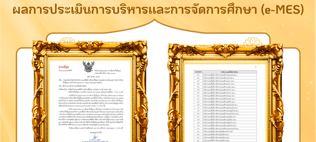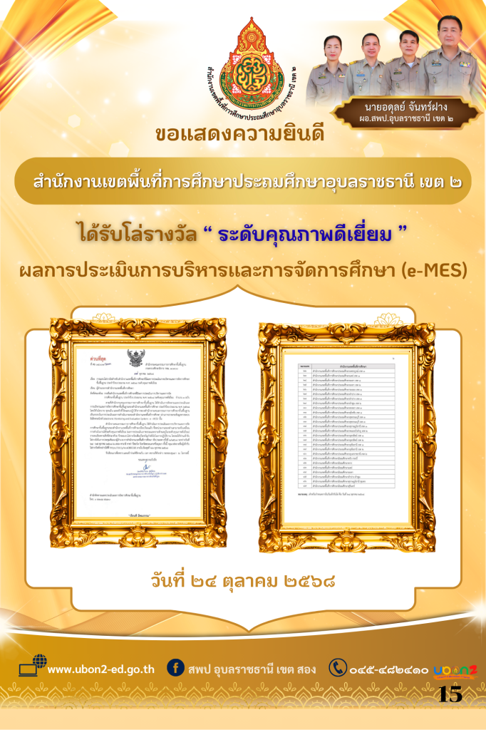 - ขอแสดงความยินดี สำนักงานเขตพื้นที่การศึกษาประถมศึกษาอุบลราชธานี เขต ๒ ได้รับโล่รางวัล “ ระดับคุณภาพดีเยี่ยม ” ผลการประเมินการบริหารเเละการจัดการศึกษา (e-MES)