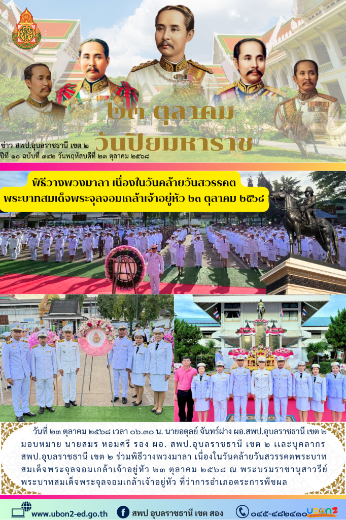 วันที่ ๒๓ ตุลาคม ๒๕๖๘ เวลา ๐๖.๓๐ น. นายอดุลย์ จันทร์ฝาง ผอ.สพป.อุบลราชธานี เขต ๒ มอบหมาย นายสมร หอมศรี รอง ผอ. สพป.อุบลราชธานี เขต ๒ เเละบุคลากร สพป.อุบลราชธานี เขต ๒ ร่วมพิธีวางพวงมาลา เนื่องในวันคล้ายวันสวรรคตพระบาทสมเด็จพระจุลจอมเกล้าเจ้าอยู่หัว ๒๓ ตุลาคม ๒๕๖๘ ณ พระบรมราชานุสาวรีย์ พระบาทสมเด็จพระจุลจอมเกล้าเจ้าอยู่หัว ที่ว่าการอำเภอตระการพืชผล