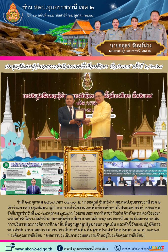 วันที่ ๒๕ ตุลาคม ๒๕๖๘ เวลา ๐๘.๓๐ น. นายอดุลย์ จันทร์ฝาง ผอ.สพป.อุบลราชธานี เขต ๒ เข้าร่วมการประชุมสัมมนาผู้อำนวยการสำนักงานเขตพื้นที่การศึกษาทั่วประเทศ ครั้งที่ ๒/๒๕๖๘ จัดขึ้นระหว่างวันที่ ๒๔ – ๒๕ ตุลาคม ๒๕๖๘ ณ โรงแรม เดอะ คาวาลิ คาซ่า รีสอร์ท จังหวัดพระนครศรีอยุธยา พร้อมทั้งรับโล่รางวัลสำนักงานเขตพื้นที่การศึกษาประถมศึกษาอุบลราชธานี เขต ๒ มีผลการประเมินการบริหารและการจัดการศึกษาขั้นพื้นฐานตามนโยบายและจุดเน้น และตัวชี้วัดแผนปฏิบัติการของสำนักงานคณะกรรมการการศึกษาขั้นพื้นพื้นฐานประจำปีงบประมาณ พ.ศ. ๒๕๖๘ “ ระดับคุณภาพดีเยี่ยม ” (ผลการประเมินภาพรวมและรายด้านอยู่ในระดับคุณภาพดีเยี่ยม)