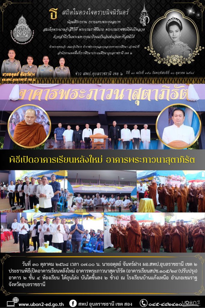 วันที่ ๓๐ ตุลาคม ๒๕๖๘ เวลา ๐๗.๐๐ น. นายอดุลย์ จันทร์ฝาง ผอ.สพป.อุบลราชธานี เขต ๒ ประธานพิธีเปิดอาคารเรียนหลังใหม่ อาคารพระภาวนาสุตาภิรัต (อาคารเรียนสปช.๑๐๕/๒๙ (ปรับปรุง) อาคาร ๒ ชั้น ๔ ห้องเรียน ใต้ถุนโล่ง บันไดขึ้นลง ๒ ข้าง) ณ โรงเรียนบ้านเเก้งเหนือ อำเภอเขมราฐ จังหวัดอุบลราชธานี