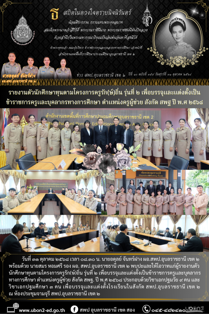 วันที่ ๓๑ ตุลาคม ๒๕๖๘ เวลา ๐๘.๓๐ น. นายอดุลย์ จันทร์ฝาง ผอ.สพป.อุบลราชธานี เขต ๒ พร้อมด้วย นายสมร หอมศรี รอง ผอ. สพป.อุบลราชธานี เขต ๒ พบปะและให้โอวาทเเก่ผู้รายงานตัวนักศึกษาทุนตามโครงการครูรัก(ษ์)ถิ่น รุ่นที่ ๒ เพื่อบรรจุเเละเเต่งตั้งเป็นข้าราชการครูเเละบุคลากรทางการศึกษา ตำเเหน่งครูผู้ช่วย สังกัด สพฐ. ปี พ.ศ ๒๕๖๘ ประกอบด้วยวิชาเอกปฐมวัย ๙ คน เเละวิชาเอกปฐมศึกษา ๓ คน เพื่อบรรจุเเละเเต่งตั้งโรงเรียนในสังกัด สพป.อุบลราชธานี เขต ๒ ณ ห้องประชุมจามจุรี สพป.อุบลราชธานี เขต ๒