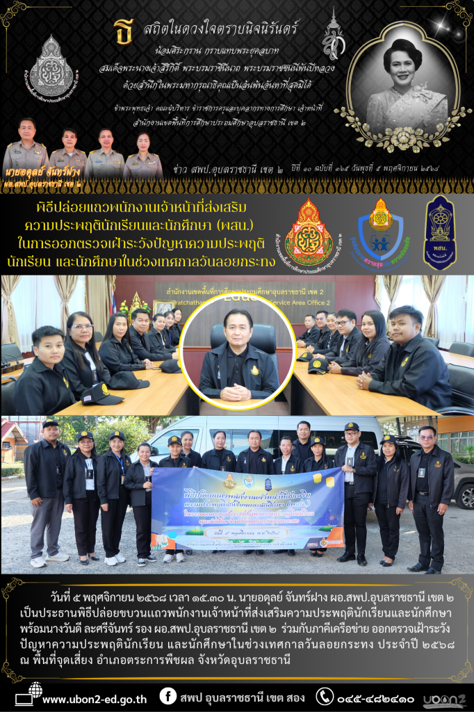 วันที่ ๕ พฤศจิกายน ๒๕๖๘ เวลา ๑๕.๓๐ น. นายอดุลย์ จันทร์ฝาง ผอ.สพป.อุบลราชธานี เขต ๒ เป็นประธานพิธีปล่อยขบวนเเถวพนักงานเจ้าหน้าที่ส่งเสริมความประพฤตินักเรียนและนักศึกษา พร้อมนางวันดี ละศรีจันทร์ รอง ผอ.สพป.อุบลราชธานี เขต ๒ ร่วมกับภาคีเครือข่าย ออกตรวจเฝ้าระวังปัญหาความประพฤตินักเรียน และนักศึกษาในช่วงเทศกาลวันลอยกระทง ประจำปี ๒๕๖๘ ณ พื้นที่จุดเสี่ยง อำเภอตระการพืชผล จังหวัดอุบลราชธานี
