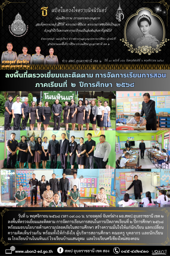 วันที่ ๖ พฤศจิกายน ๒๕๖๘ เวลา ๐๙.๐๐ น. นายอดุลย์ จันทร์ฝาง ผอ.สพป.อุบลราชธานี เขต ๒ ลงพื้นที่ตรวจเยี่ยมและติดตาม การจัดการเรียนการสอนในการเปิดภาคเรียนที่ ๒ ปีการศึกษา ๒๕๖๘ พร้อมมอบนโยบายด้านความปลอดภัยในสถานศึกษา สร้างความมั่นใจให้แก่นักเรียน แลกเปลี่ยนความคิดเห็นร่วมกัน พร้อมทั้งให้กำลังใจ ผู้บริหารสถานศึกษา คณะครู บุคลากร เเละนักเรียน ณ โรงเรียนบ้านโนนหินเเร่ โรงเรียนบ้านเเสนอุดม เเละโรงเรียนศรีเชียงใหม่สองคอน