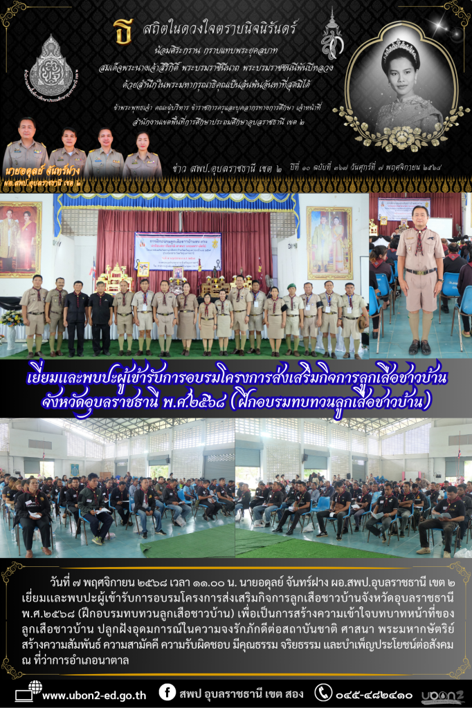 วันที่ ๗ พฤศจิกายน ๒๕๖๘ เวลา ๑๑.๐๐ น. นายอดุลย์ จันทร์ฝาง ผอ.สพป.อุบลราชธานี เขต ๒ เยี่ี่ยมเเละพบปะผู้เข้ารับการอบรมโครงการส่งเสริมกิจการลูกเสือชาวบ้านจังหวัดอุบลราชธานี พ.ศ.๒๕๖๘ (ฝึกอบรมทบทวนลูกเสือชาวบ้าน) เพื่อเป็นการสร้างความเข้าใจบทบาทหน้าที่ของลูกเสือชาวบ้าน ปลูกฝังอุดมการณ์ในความจงรักภักดีต่อสถาบันชาติ ศาสนา พระมหากษัตริย์ สร้างความสัมพันธ์ ความสามัคคี ความรับผิดชอบ มีคุณธรรม จริยธรรม เเละบำเพ็ญประโยชน์ต่อสังคม ณ ที่ว่าการอำเภอนาตาล
