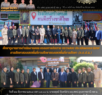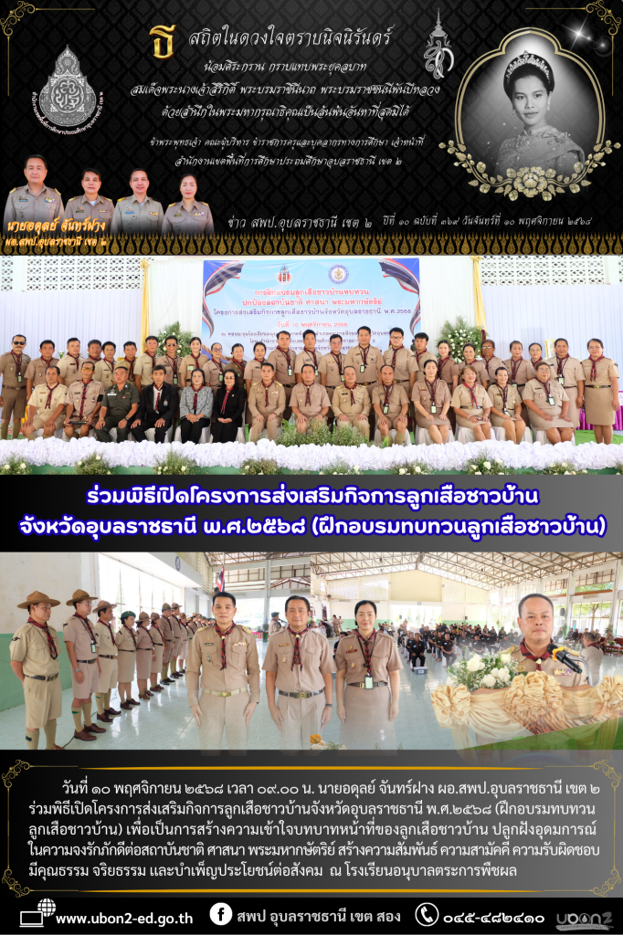 วันที่ ๑๐ พฤศจิกายน ๒๕๖๘ เวลา ๐๙.๐๐ น. นายอดุลย์ จันทร์ฝาง ผอ.สพป.อุบลราชธานี เขต ๒ ร่วมพิธีเปิดโครงการส่งเสริมกิจการลูกเสือชาวบ้านจังหวัดอุบลราชธานี พ.ศ.๒๕๖๘ (ฝึกอบรมทบทวนลูกเสือชาวบ้าน) เพื่อเป็นการสร้างความเข้าใจบทบาทหน้าที่ของลูกเสือชาวบ้าน ปลูกฝังอุดมการณ์ในความจงรักภักดีต่อสถาบันชาติ ศาสนา พระมหากษัตริย์ สร้างความสัมพันธ์ ความสามัคคี ความรับผิดชอบ มีคุณธรรม จริยธรรม เเละบำเพ็ญประโยชน์ต่อสังคม ณ โรงเรียนอนุบาลตระการพืชผล