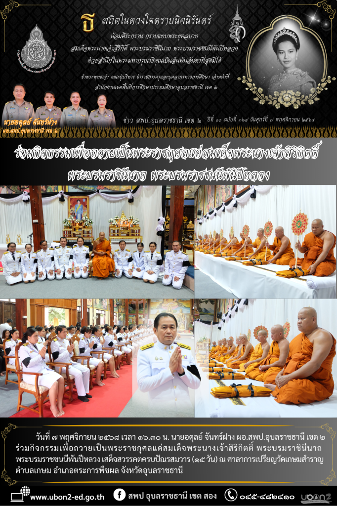 วันที่ ๗ พฤศจิกายน ๒๕๖๘ เวลา ๑๖.๓๐ น. นายอดุลย์ จันทร์ฝาง ผอ.สพป.อุบลราชธานี เขต ๒ ร่วมกิจกรรมเพื่อถวายเป็นพระราชกุศลแด่สมเด็จพระนางเจ้าสิริกิตติ์ พระบรมราชินีนาถ พระบรมราชชนนีพันปีหลวง เสด็จสวรรคตครบปัณรสมวาร (๑๕ วัน) ณ ศาลาการเปรียญวัดเกษมสำราญ ตำบลเกษม อำเภอตระการพืชผล จังหวัดอุบลราชธานี