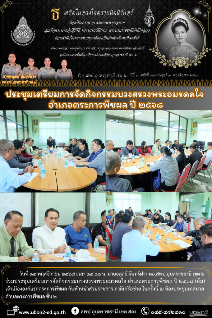 วันที่ ๑๔ พฤศจิกายน ๒๕๖๘ เวลา ๑๔.๐๐ น. นายอดุลย์ จันทร์ฝาง ผอ.สพป.อุบลราชธานี เขต ๒ ร่วมประชุมเตรียมการจัดกิจกรรมบวงสรวงพระอมรดลใจ อำเภอตระการพืชผล ปี ๒๕๖๘ (อ้ม) เจ้าเมืององค์แรกตระการพืชผล กับหัวหน้าส่วนราชการ ภาคีเครือข่าย ในครั้งนี้ ณ ห้องประชุมเทศบาลตำบลตระการพืชผล ชั้น ๒