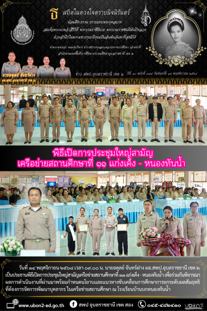 วันที่ ๑๔ พฤศจิกายน ๒๕๖๘ เวลา ๐๙.๐๐ น. นายอดุลย์ จันทร์ฝาง ผอ.สพป.อุบลราชธานี เขต ๒ เป็นประธานพิธีเปิดการประชุมใหญ่สามัญเครือข่ายสถานศึกษาที่ ๑๑ เเก่งเค็ง – หนองทันน้ำ เพื่อร่วมกันพิจารณาผลการดำเนินงานที่ผ่านมาพร้อมกำหนดนโยาบเเละเเนวทางขับเคลื่อนการศึกษาการยกระดับผลสัมฤทธิ ที่ต้องการจัดการพัฒนาบุคลากร ในเครือข่ายสถานศึกษา ณ โรงเรียนบ้านบกหนองทันน้ำ พิิธีเปิดการประชุมใหญ่สามัญเครือข่ายสถานศึกษาที่ ๑๑ เเก่งเค็ง – หนองทันน้ำ