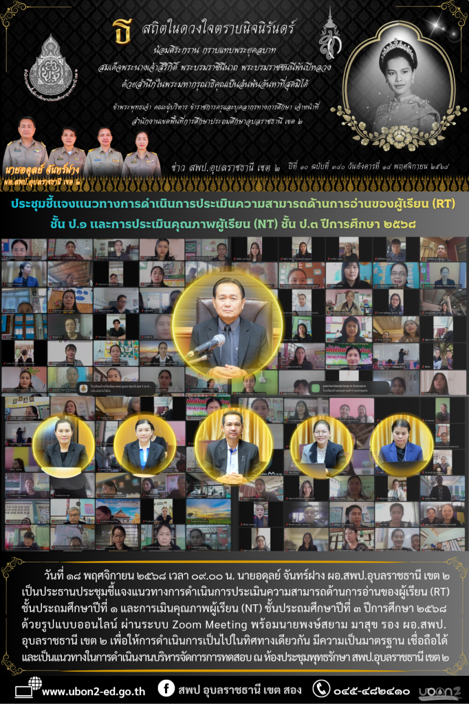วันที่ ๑๘ พฤศจิกายน ๒๕๖๘ เวลา ๐๙.๐๐ น. นายอดุลย์ จันทร์ฝาง ผอ.สพป.อุบลราชธานี เขต ๒ เป็นประธานประชุมชี้แจงแนวทางการดำเนินการประเมินความสามารถด้านการอ่านของผู้เรียน (RT) ชั้นประถมศึกษาปีที่ ๑ และการเมินคุณภาพผู้เรียน (NT) ชั้นประถมศึกษาปีที่ ๓ ปีการศึกษา ๒๕๖๘ ด้วยรูปแบบออนไลน์ ผ่านระบบ Zoom Meeting พร้อมนายพงษ์สยาม มาสุข รอง ผอ.สพป.อุบลราชธานี เขต ๒ เพื่อให้การดำเนินการเป็นไปในทิศทางเดียวกัน มีความเป็นมาตรฐาน เชื่อถือได้ เเละเป็นเเนวทางในการดำเนินงานบริหารจัดการการทดสอบ ณ ห้องประชุมพุทธรักษา สพป.อุบลราชธานี เขต ๒