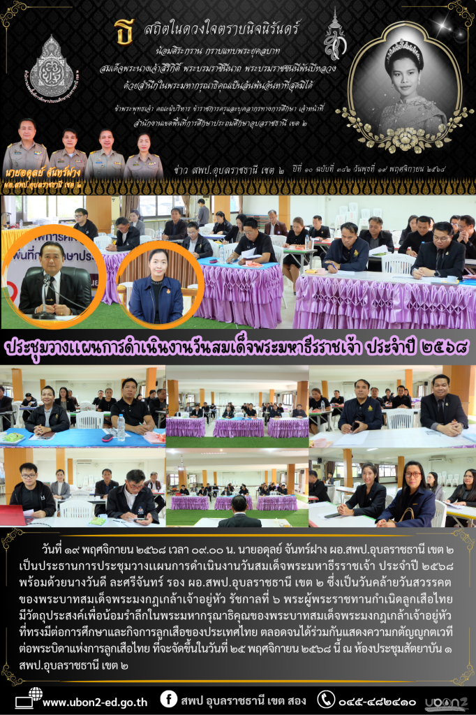 วันที่ ๑๙ พฤศจิกายน ๒๕๖๘ เวลา ๐๙.๐๐ น. นายอดุลย์ จันทร์ฝาง ผอ.สพป.อุบลราชธานี เขต ๒ เป็นประธานการประชุมวางเเผนการดำเนินงานวันสมเด็จพระมหาธีรราชเจ้า ประจำปี ๒๕๖๘ พร้อมด้วยนางวันดี ละศรีจันทร์ รอง ผอ.สพป.อุบลราชธานี เขต ๒ ซึ่งเป็นวันคล้ายวันสวรรคตของพระบาทสมเด็จพระมงกฎเกล้าเจ้าอยู่หัว รัชกาลที่ ๖ พระผู้พระราชทานกำเนิดลูกเสือไทย มีวัตถุประสงค์เพื่อน้อมรำลึกในพระมหากรุณาธิคุณของพระบาทสมเด็จพระมงกฎเกล้าเจ้าอยู่หัว ที่ทรงมีต่อการศึกษาและกิจการลูกเสือของประเทศไทย ตลอดจนได้ร่วมกันแสดงความกตัญญูกตเวทีต่อพระบิดาแห่งการลูกเสือไทย ที่จะจัดขึ้นในวันที่ ๒๕ พฤศจิกายน ๒๕๖๘ นี้ ณ ห้องประชุมสัตยาบัน ๑ สพป.อุบลราชธานี เขต ๒