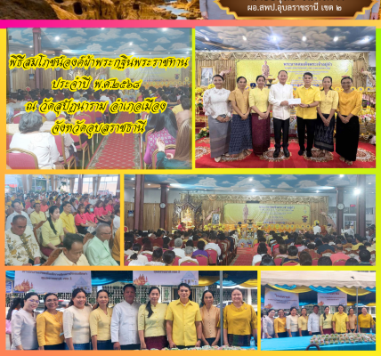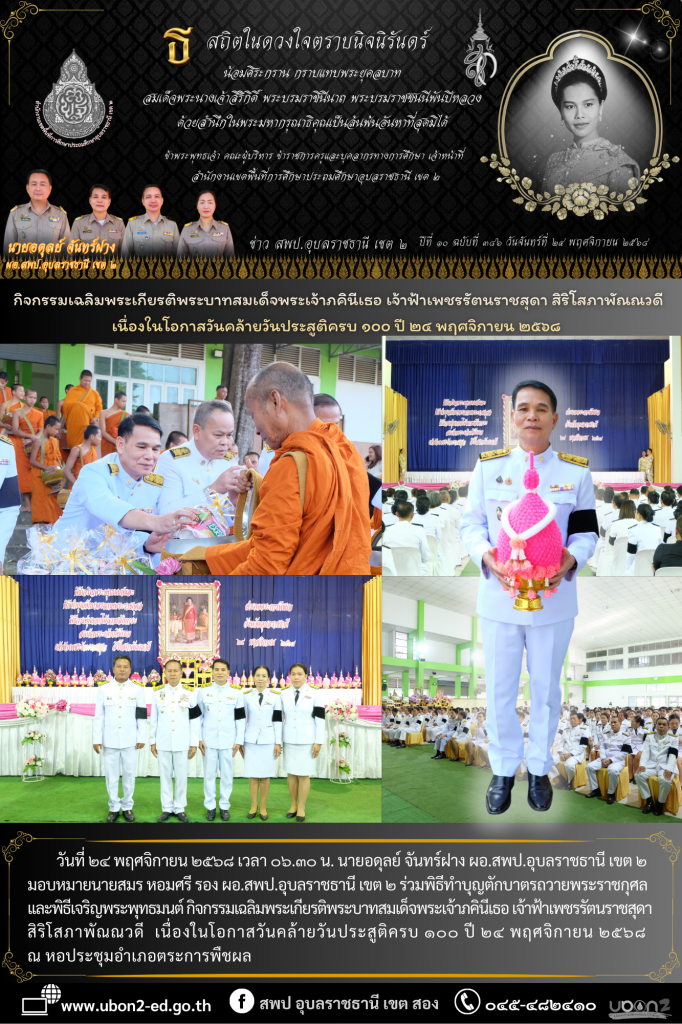 วันที่ ๒๔ พฤศจิกายน ๒๕๖๘ เวลา ๐๖.๓๐ น. นายอดุลย์ จันทร์ฝาง ผอ.สพป.อุบลราชธานี เขต ๒ มอบหมายนายสมร หอมศรี รอง ผอ.สพป.อุบลราชธานี เขต ๒ ร่วมพิธีทำบุญตักบาตรถวายพระราชกุศลเเละพิธีเจริญพระพุทธมนต์ กิจกรรมเฉลิมพระเกียรติพระบาทสมเด็จพระเจ้าภคินีเธอ เจ้าฟ้าเพชรรัตนราชสุดา สิริโสภาพัณณวดี เนื่องในโอกาสวันคล้ายวันประสูติครบ ๑๐๐ ปี ๒๔ พฤศจิกายน ๒๕๖๘ ณ หอประชุมอำเภอตระการพืชผล
