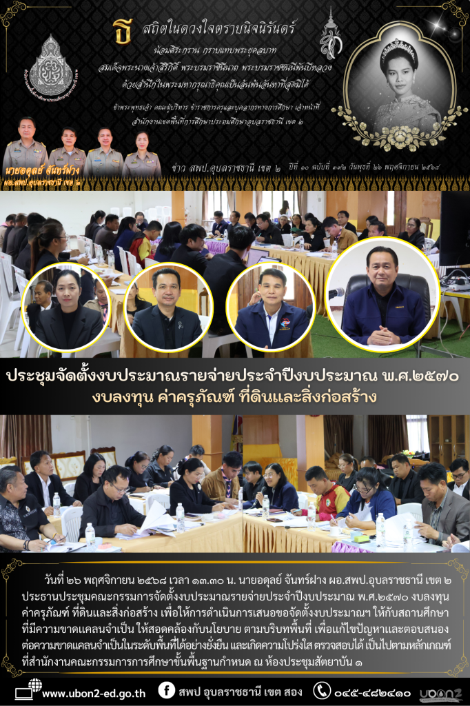 วันที่ ๒๖ พฤศจิกายน ๒๕๖๘ เวลา ๑๓.๓๐ น. นายอดุลย์ จันทร์ฝาง ผอ.สพป.อุบลราชธานี เขต ๒ ประธานประชุมคณะกรรมการจัดตั้งงบประมาณรายจ่ายประจำปีงบประมาณ พ.ศ.๒๕๗๐ งบลงทุน ค่าครุภัณฑ์ ที่ดินเเละสิ่งก่อสร้าง เพื่อให้การดำเนินการเสนอขอจัดตั้งงบประมาณฯ ให้กับสถานศึกษาที่มีความขาดเเคลนจำเป็น ให้สอดคล้องกับนโยบาย ตามบริบทพื้นที่ เพื่อเเก้ไขปัญหาเเละตอบสนองต่อความขาดเเคลนจำเป็นในระดับพื้นที่ได้อย่างยั่งยืน เเละเกิดความโปร่งใส ตรวจสอบได้ เป็นไปตามหลักเกณฑ์ที่สำนักงานคณะกรรมการการศึกษาขั้นพื้นฐานกำหนด ณ ห้องประชุมสัตยาบัน ๑