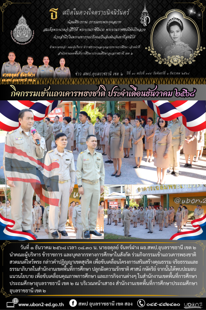วันที่ ๑ ธันวาคม ๒๕๖๘ เวลา ๐๘.๓๐ น. นายอดุลย์ จันทร์ฝาง ผอ.สพป.อุบลราชธานี เขต ๒ นำคณะผู้บริหาร ข้าราชการ และบุคลากรทางการศึกษาในสังกัด ร่วมกิจกรรมเข้าแถวเคารพธงชาติ สวดมนต์ไหว้พระ กล่าวคำปฏิญญาเขตสุจริต เพื่อขับเคลื่อนโครงการเสริมสร้างคุณธรรม จริยธรรมและธรรมาภิบาลในสำนักงานเขตพื้นที่การศึกษา ปลูกฝังความรักชาติ ศาสน์ กษัตริย์ จากนั้นได้พบปะมอบแนวนโยบาย เพื่อขับเคลื่อนคุณภาพการศึกษา และภารกิจงานต่างๆ ในสำนักงานเขตพื้นที่การศึกษาประถมศึกษาอุบลราชธานี เขต ๒ ณ บริเวณหน้าเสาธง สำนักงานเขตพื้นที่การศึกษาประถมศึกษาอุบลราชธานี เขต ๒