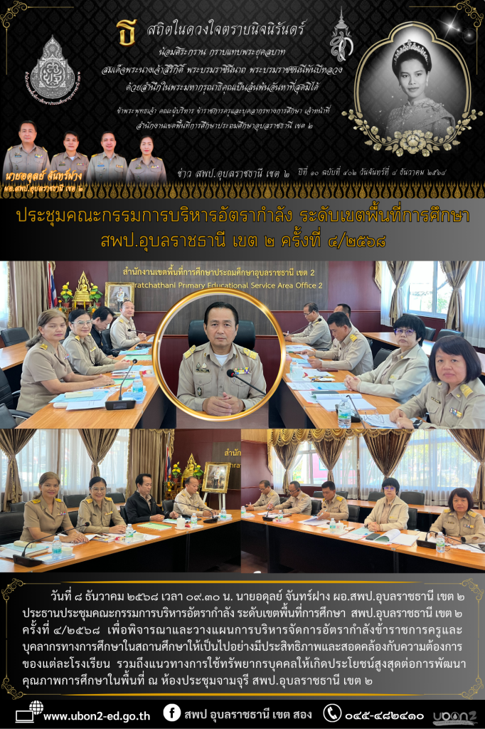 วันที่ ๘ ธันวาคม ๒๕๖๘ เวลา ๐๙.๓๐ น. นายอดุลย์ จันทร์ฝาง ผอ.สพป.อุบลราชธานี เขต ๒ ประธานประชุมคณะกรรมการบริหารอัตรากำลัง ระดับเขตพื้นที่การศึกษา สพป.อุบลราชธานี เขต ๒ ครั้งที่ ๔/๒๕๖๘ เพื่อพิจารณาและวางแผนการบริหารจัดการอัตรากำลังข้าราชการครูและบุคลากรทางการศึกษาในสถานศึกษาให้เป็นไปอย่างมีประสิทธิภาพและสอดคล้องกับความต้องการของแต่ละโรงเรียน รวมถึงแนวทางการใช้ทรัพยากรบุคคลให้เกิดประโยชน์สูงสุดต่อการพัฒนาคุณภาพการศึกษาในพื้นที่ ณ ห้องประชุมจามจุรี สพป.อุบลราชธานี เขต ๒