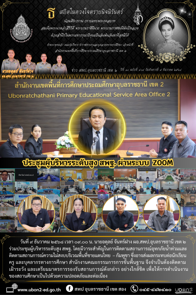 วันที่ ๙ ธันวาคม ๒๕๖๘ เวลา ๐๙.๐๐ น. นายอดุลย์ จันทร์ฝาง ผอ.สพป.อุบลราชธานี เขต ๒ ร่วมประชุมผู้บริหารระดับสูง สพฐ. โดยมีวาระสำคัญในการติดตามสถานการณ์อุทกภัยน้ำท่วมและติดตามสถานการณ์ความไม่สงบบริเวณพื้นที่ชายแดนไทย – กัมพูชา ซึ่งอาจส่งผลกระทบต่อนักเรียน ครู และบุคลากรทางการศึกษา สำนักงานคณะกรรมการการขั้นพื้นฐาน จึงจำเป็นต้องติดตาม เฝ้าระวัง และเตรียมมาตรการรองรับสถานการณ์ดังกล่าว อย่างใกล้ชิด เพื่อให้การดำเนินงานของสถานศึกษาเป็นไปด้วยความปลอดภัยและต่อเนื่อง