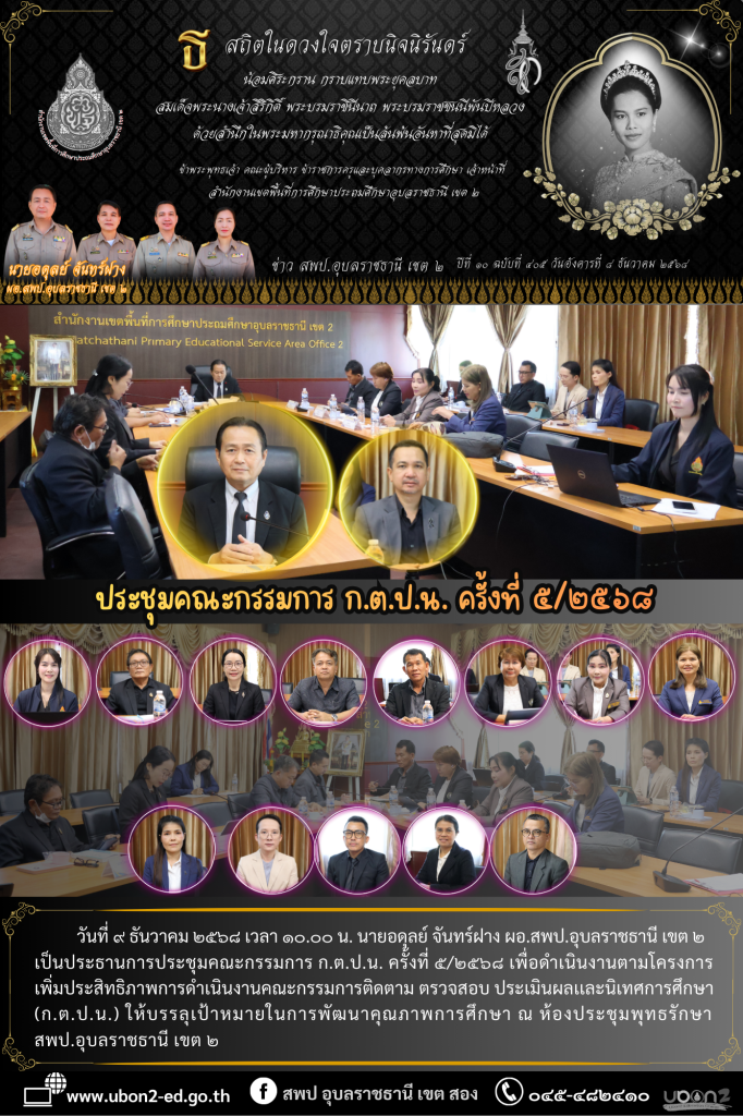 วันที่ ๙ ธันวาคม ๒๕๖๘ เวลา ๑๐.๐๐ น. นายอดุลย์ จันทร์ฝาง ผอ.สพป.อุบลราชธานี เขต ๒ เป็นประธานการประชุมคณะกรรมการ ก.ต.ป.น. ครั้งที่ ๕/๒๕๖๘ เพื่อดำเนินงานตามโครงการเพิ่มประสิทธิภาพการดำเนินงานคณะกรรมการติดตาม ตรวจสอบ ประเมินผลเเละนิเทศการศึกษา (ก.ต.ป.น.) ให้บรรลุเป้าหมายในการพัฒนาคุณภาพการศึกษา ณ ห้องประชุมพุทธรักษา สพป.อุบลราชธานี เขต ๒