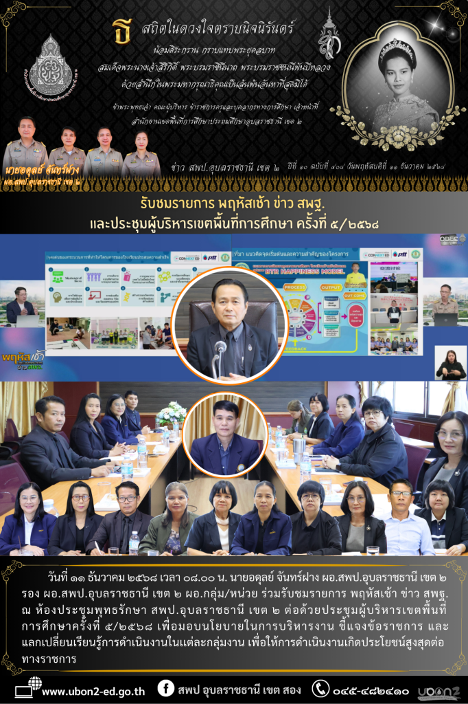 วันที่ ๑๑ ธันวาคม ๒๕๖๘ เวลา ๐๘.๐๐ น. นายอดุลย์ จันทร์ฝาง ผอ.สพป.อุบลราชธานี เขต ๒ รอง ผอ.สพป.อุบลราชธานี เขต ๒ ผอ.กลุ่ม/หน่วย ร่วมรับชมรายการ พฤหัสเช้า ข่าว สพฐ. ณ ห้องประชุมพุทธรักษา สพป.อุบลราชธานี เขต ๒ ต่อด้วยประชุมผู้บริหารเขตพื้นที่การศึกษาครั้งที่ ๕/๒๕๖๘ เพื่อมอบนโยบายในการบริหารงาน ชี้แจงข้อราชการ และแลกเปลี่ยนเรียนรู้การดำเนินงานในเเต่ละกลุ่มงาน เพื่อให้การดำเนินงานเกิดประโยชน์สูงสุดต่อทางราชการ