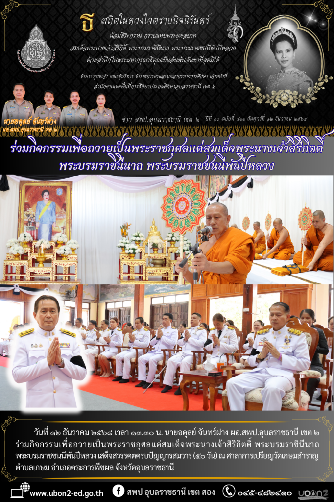 วันที่ ๑๒ ธันวาคม ๒๕๖๘ เวลา ๑๓.๓๐ น. นายอดุลย์ จันทร์ฝาง ผอ.สพป.อุบลราชธานี เขต ๒ ร่วมกิจกรรมเพื่อถวายเป็นพระราชกุศลแด่สมเด็จพระนางเจ้าสิริกิตติ์ พระบรมราชินีนาถ พระบรมราชชนนีพันปีหลวง เสด็จสวรรคตครบปัญญารสมวาร (๕๐ วัน) ณ ศาลาการเปรียญวัดเกษมสำราญ ตำบลเกษม อำเภอตระการพืชผล จังหวัดอุบลราชธานี