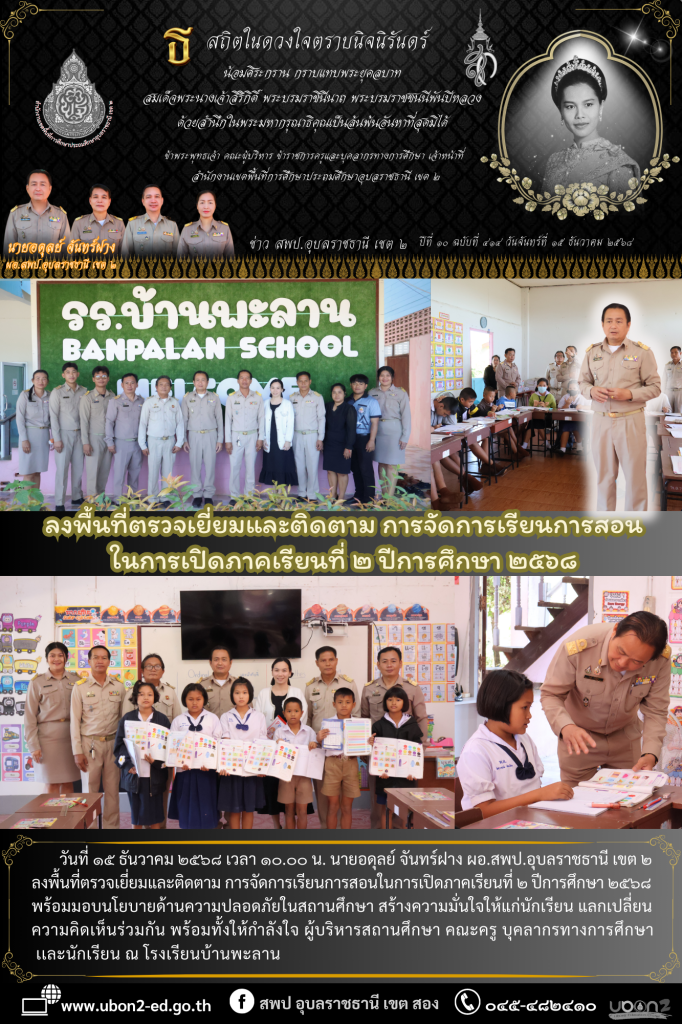 วันที่ ๑๕ ธันวาคม ๒๕๖๘ เวลา ๑๐.๐๐ น.นายอดุลย์ จันทร์ฝาง ผอ.สพป.อุบลราชธานี เขต ๒ ลงพื้นที่ตรวจเยี่ยมและติดตาม การจัดการเรียนการสอนในการเปิดภาคเรียนที่ ๒ ปีการศึกษา ๒๕๖๘ พร้อมมอบนโยบายด้านความปลอดภัยในสถานศึกษา สร้างความมั่นใจให้แก่นักเรียน แลกเปลี่ยนความคิดเห็นร่วมกัน พร้อมทั้งให้กำลังใจ ผู้บริหารสถานศึกษา คณะครู บุคลากรทางการศึกษา เเละนักเรียน ณ โรงเรียนบ้านพะลาน