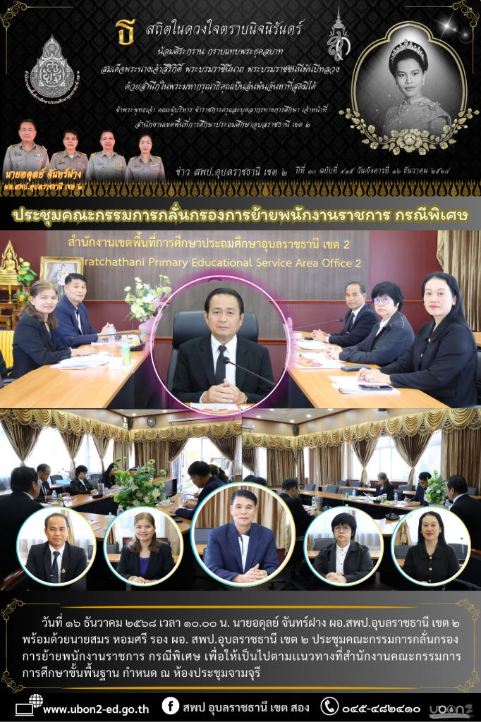 วันที่ ๑๖ ธันวาคม ๒๕๖๘ เวลา ๑๐.๐๐ น. นายอดุลย์ จันทร์ฝาง ผอ.สพป.อุบลราชธานี เขต ๒ พร้อมด้วยนายสมร หอมศรี รอง ผอ. สพป.อุบลราชธานี เขต ๒ ประชุมคณะกรรมการกลั่นกรองการย้ายพนักงานราชการ กรณีพิเศษ เพื่อให้เป็นไปตามเเนวทางที่สำนักงานคณะกรรมการการศึกษาขั้นพื้นฐาน กำหนด ณ ห้องประชุมจามจุรี